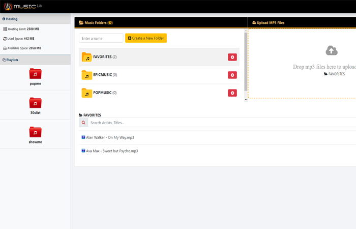 The music library allows you to create your own album folders and upload mp3 files to the folders by using drag&drop multi upload system on the same screen!
